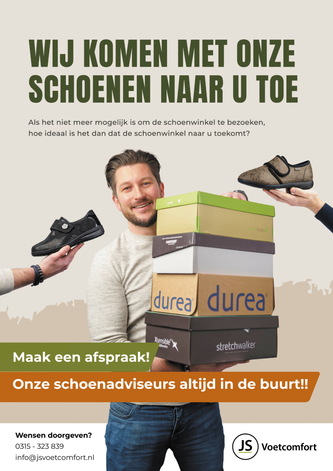 Wij zijn gespecialiseerd in comfortabele schoenen voor zowel hem als haar. We hebben een groot assortiment schoenen met uitneembare binnenzolen, in diverse wijdtematen. Onze schoenadviseurs helpen jou graag bij het maken van de juiste keuze voor schoenen in de juiste maat én breedtemaat.